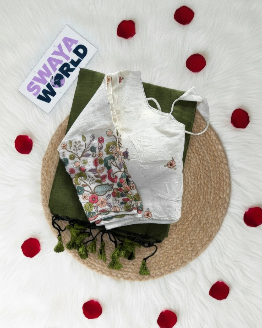 Paired with a designer blouse crafted from Aura cotton, it features heavy embroidery, padded support, and a pure cotton lining for all-day comfort. The blouse is alterable from size 38 to 42, with a secure hook closure for a tailored fit.