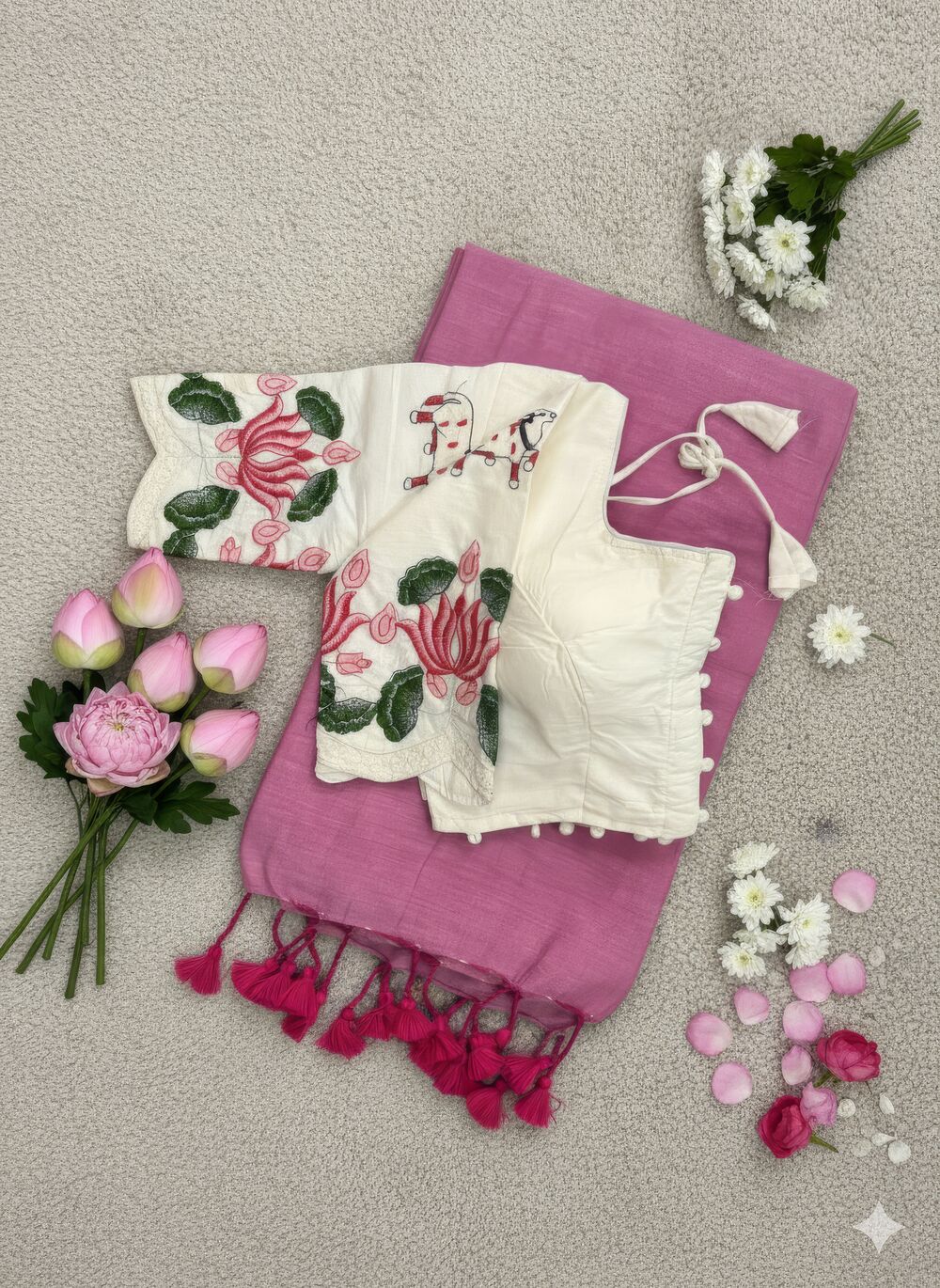 Paired with a designer blouse crafted from Aura cotton, it features heavy embroidery, padded support, and a pure cotton lining for all-day comfort. The blouse is alterable from size 38 to 42, with a secure hook closure for a tailored fit.
