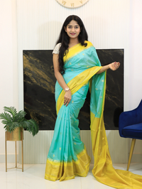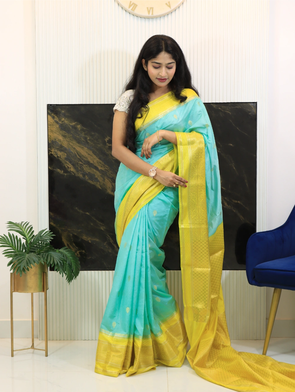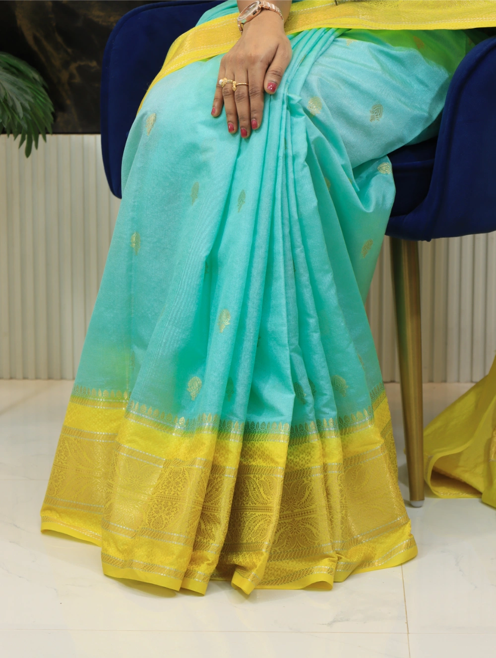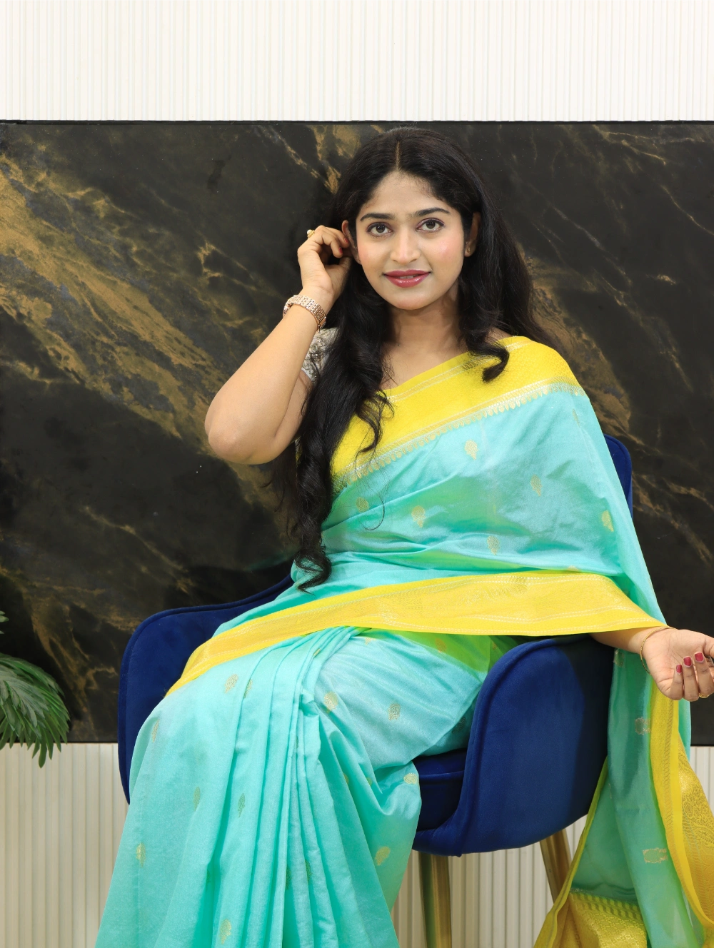The fancy contrast border showcases golden zari work with silver lining, inspired by the Grand Paithani border design, adding a regal touch to the drape. The rich jacquard pallu flows gracefully, while the matching brocade blouse piece completes the look with sophistication.