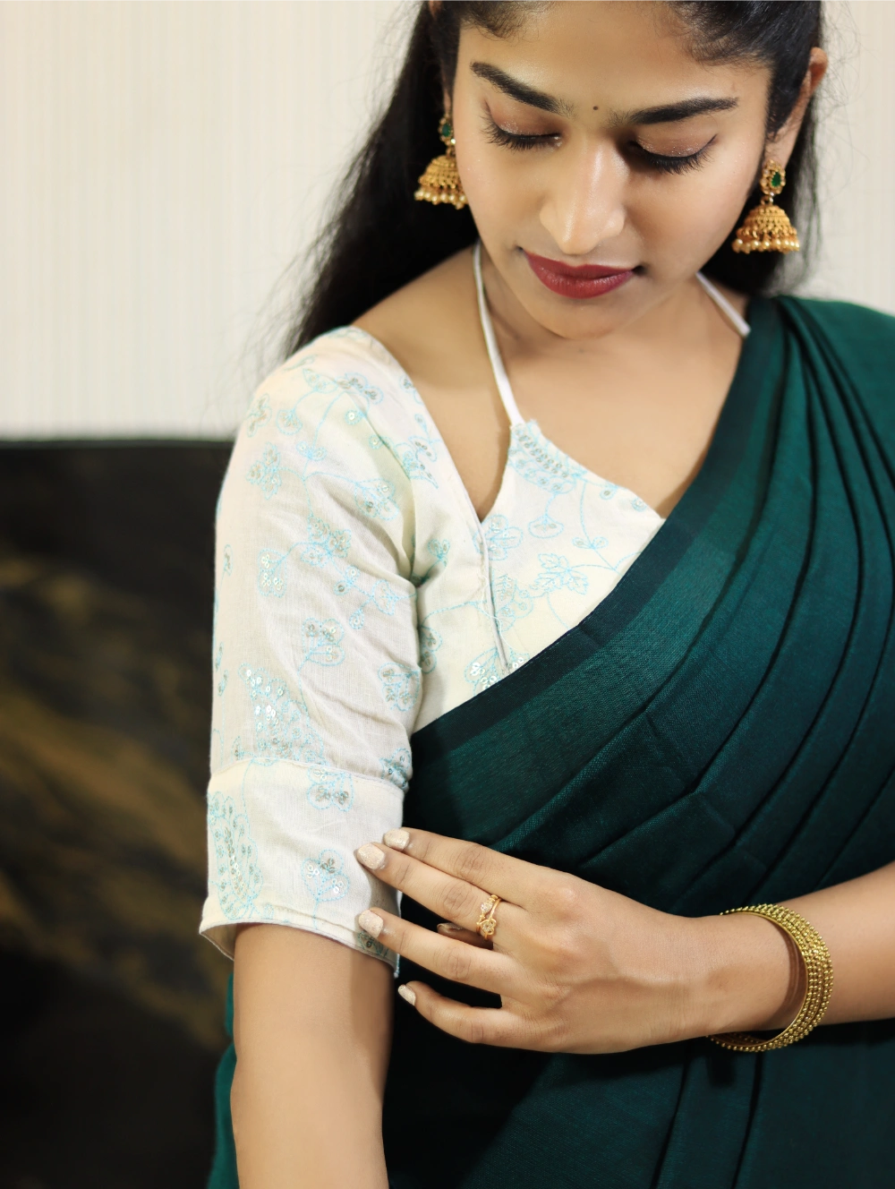 Paired with a designer blouse crafted from Aura cotton, it features heavy embroidery, padded support, and a pure cotton lining for all-day comfort. The blouse is alterable from size 38 to 42, with a secure hook closure for a tailored fit.