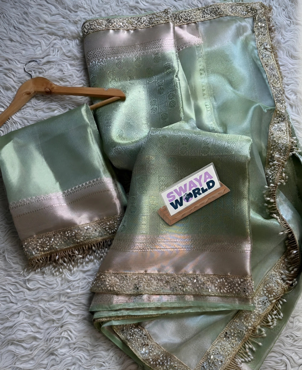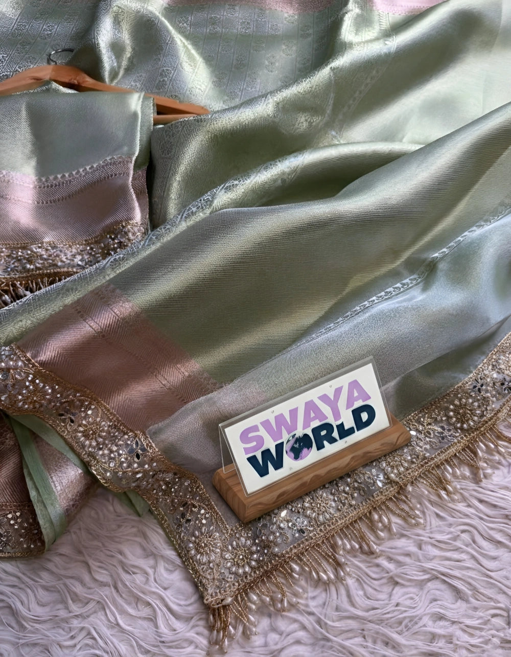Turn heads with this luxury celebrity-inspired saree, crafted from Banarasi soft tissue fabric with full-body waskat-style weaving for a rich, textured finish. The saree features fancy lace work along the borders and pallu, paired with a Banarasi zari contrast border that adds regal depth.