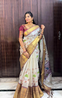 Celebrate the season in style with our Soft Banarasi Tissue Silk Saree, part of the most trending festive collection. This saree features allover hand‑painted jaal work, bringing a unique artistic touch to the luxurious tissue silk base. The look is elevated with a contrast weaving Kanchi border, adding depth, tradition, and grandeur to the drape.
