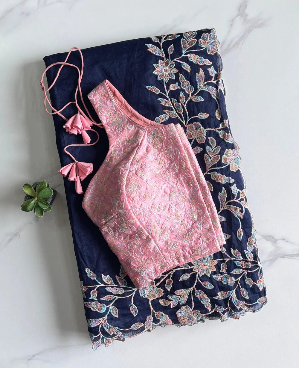 Premium Chanderi Saree with Multi-Thread Embroidery Pallu & Cutwork – Paired with Pure Chikankari Baby Pink Blouse