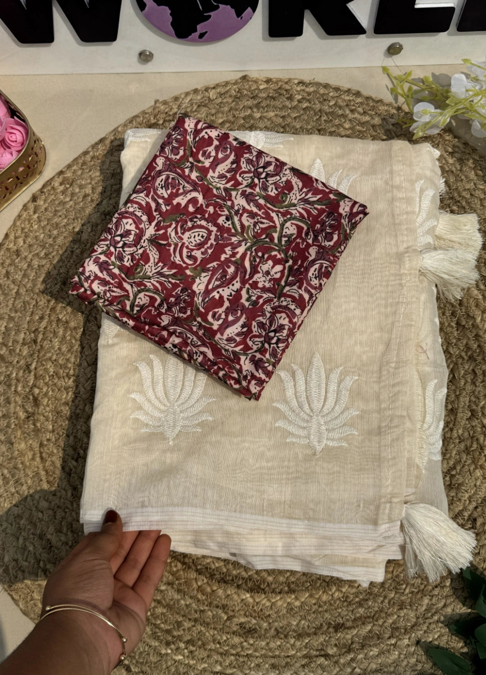 Introducing Lotus❤, a graceful blend of tradition and artistry. This Premium Chanderi Saree is adorned with off-white multithread embroidery spread across the body, creating a soft, textured elegance. The saree is finished with rich cotton tassels that add movement and a handcrafted touch to the pallu.