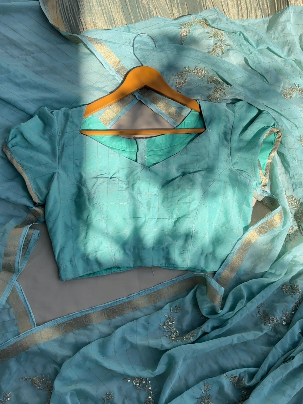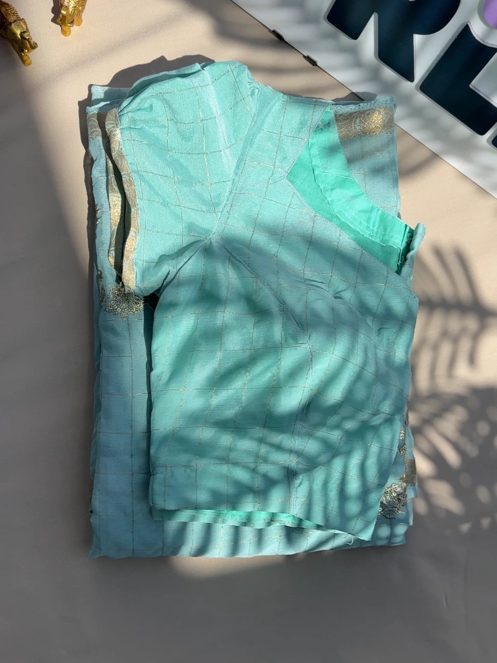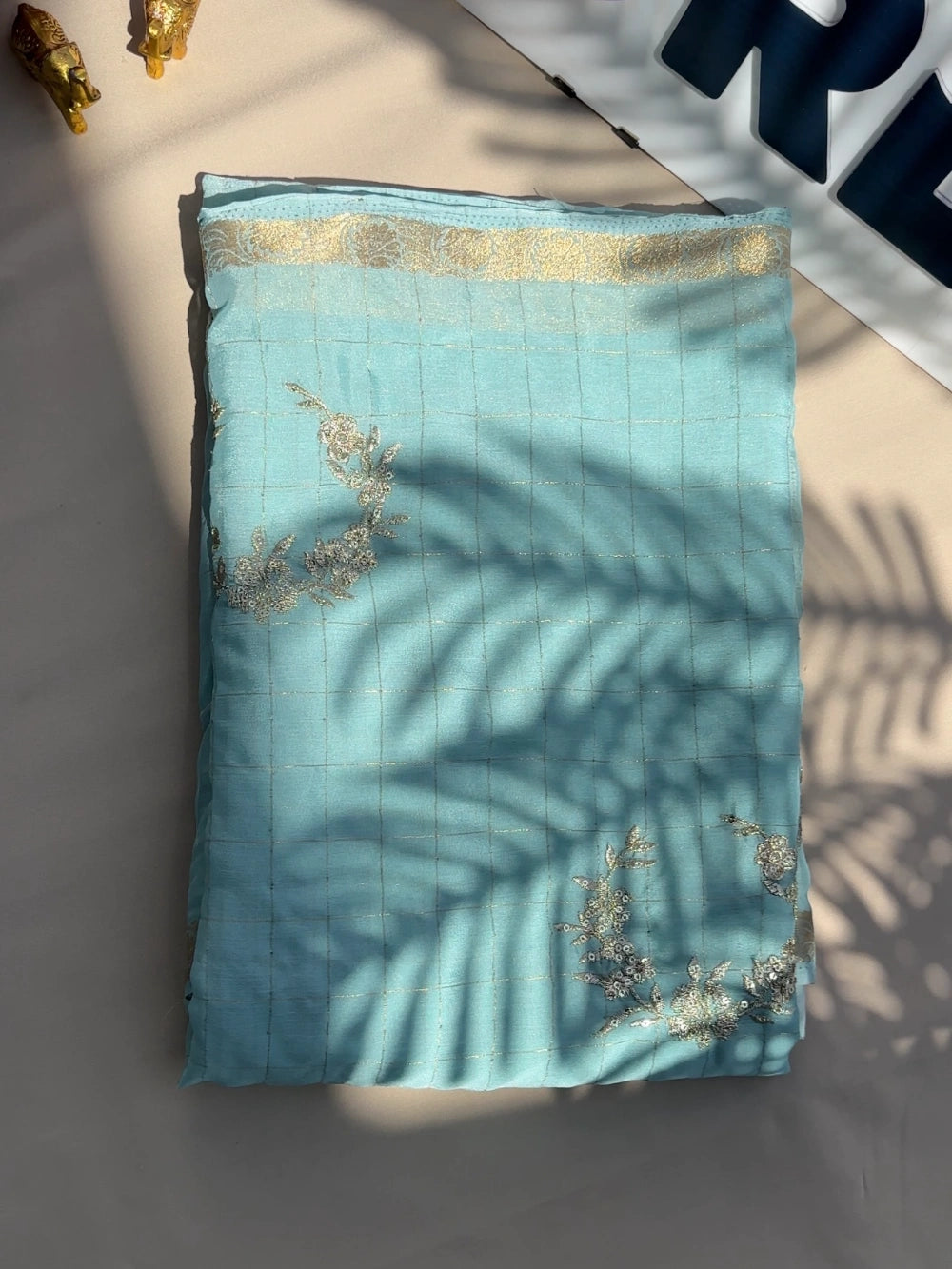Chex Chinnon Viscose Saree with Jacquard Border & Floral Sequin Embroidery - Cyan / Un-stitched Piece