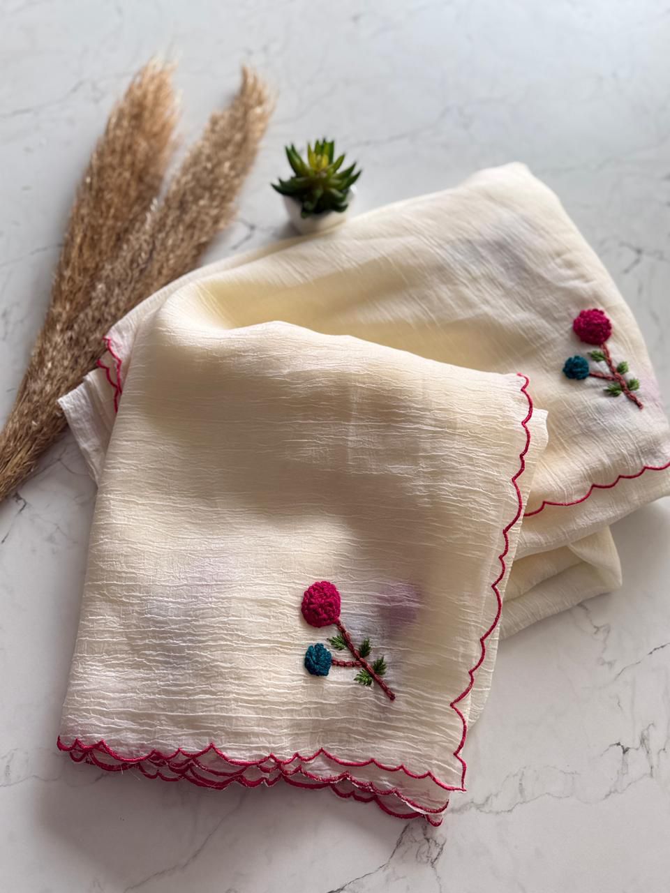 Drape yourself in handcrafted luxury with this Premium Crunchy Silk Saree, a designer masterpiece that blends texture, tradition, and trend. The saree features intricate knot thread handwork across the body, highlighted by a scalloped border that adds a couture finish. The rich, slightly textured crunchy silk fabric offers a graceful fall and a subtle sheen, perfect for festive and formal occasions.