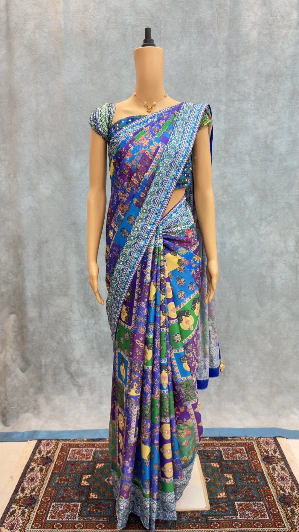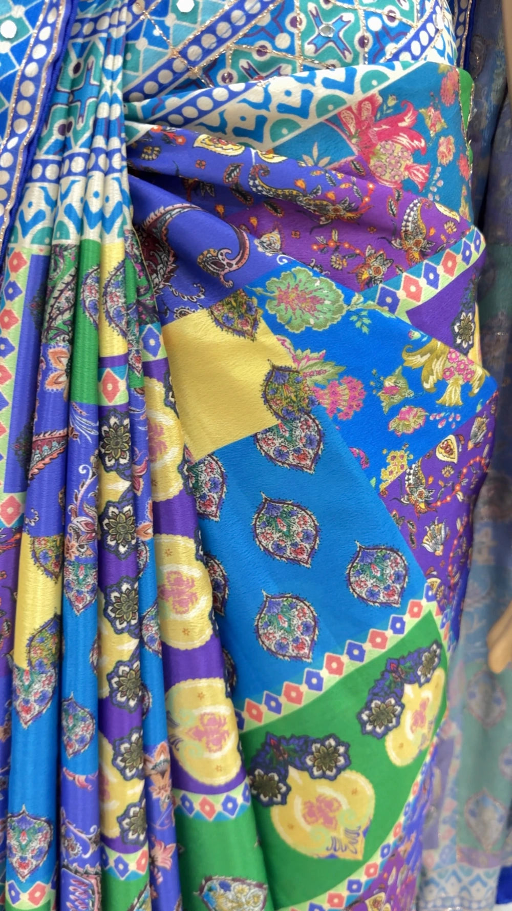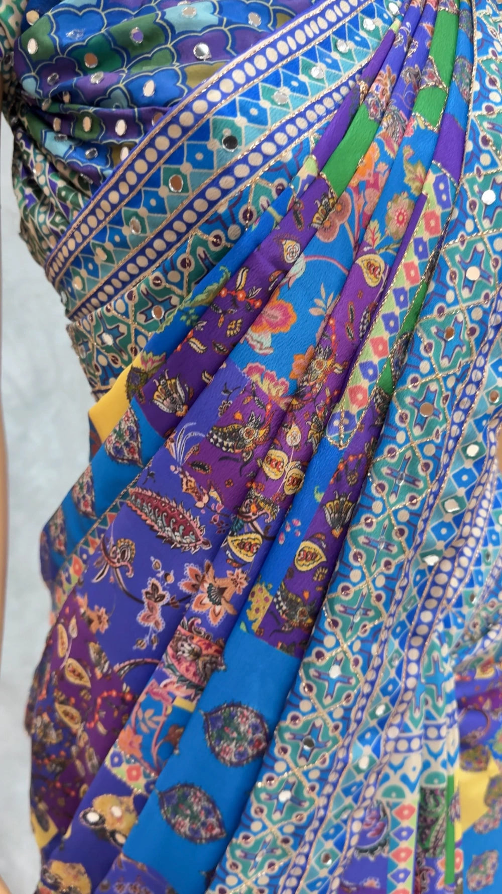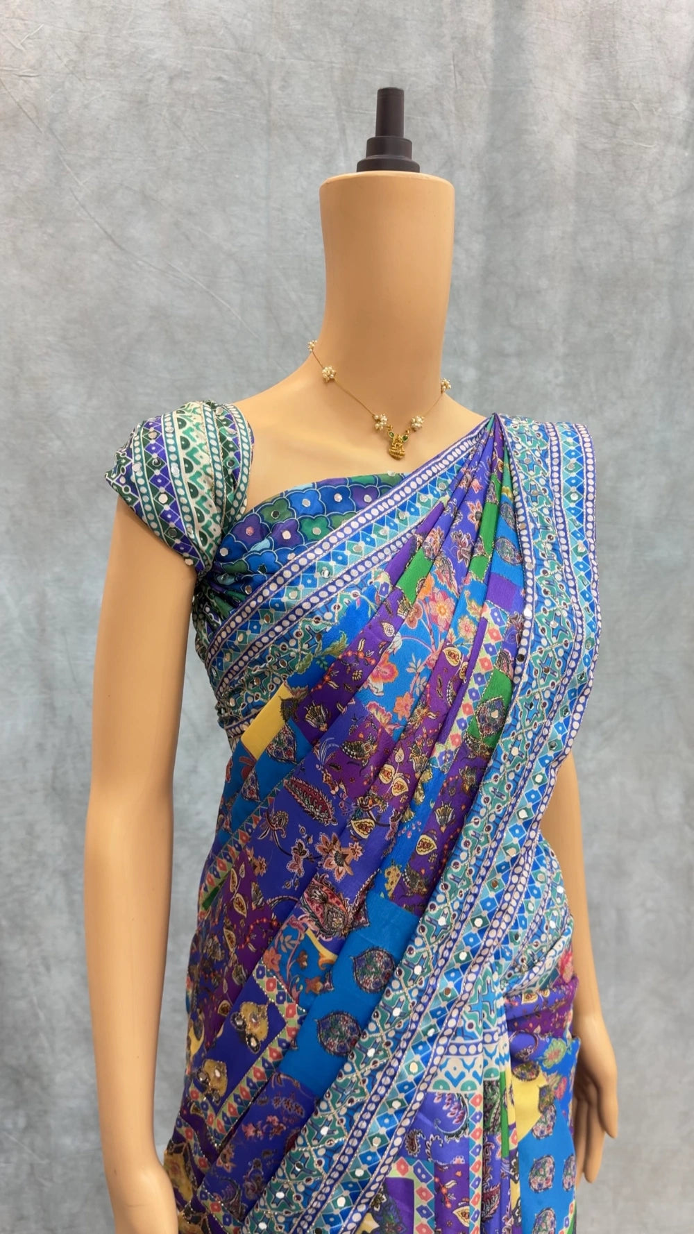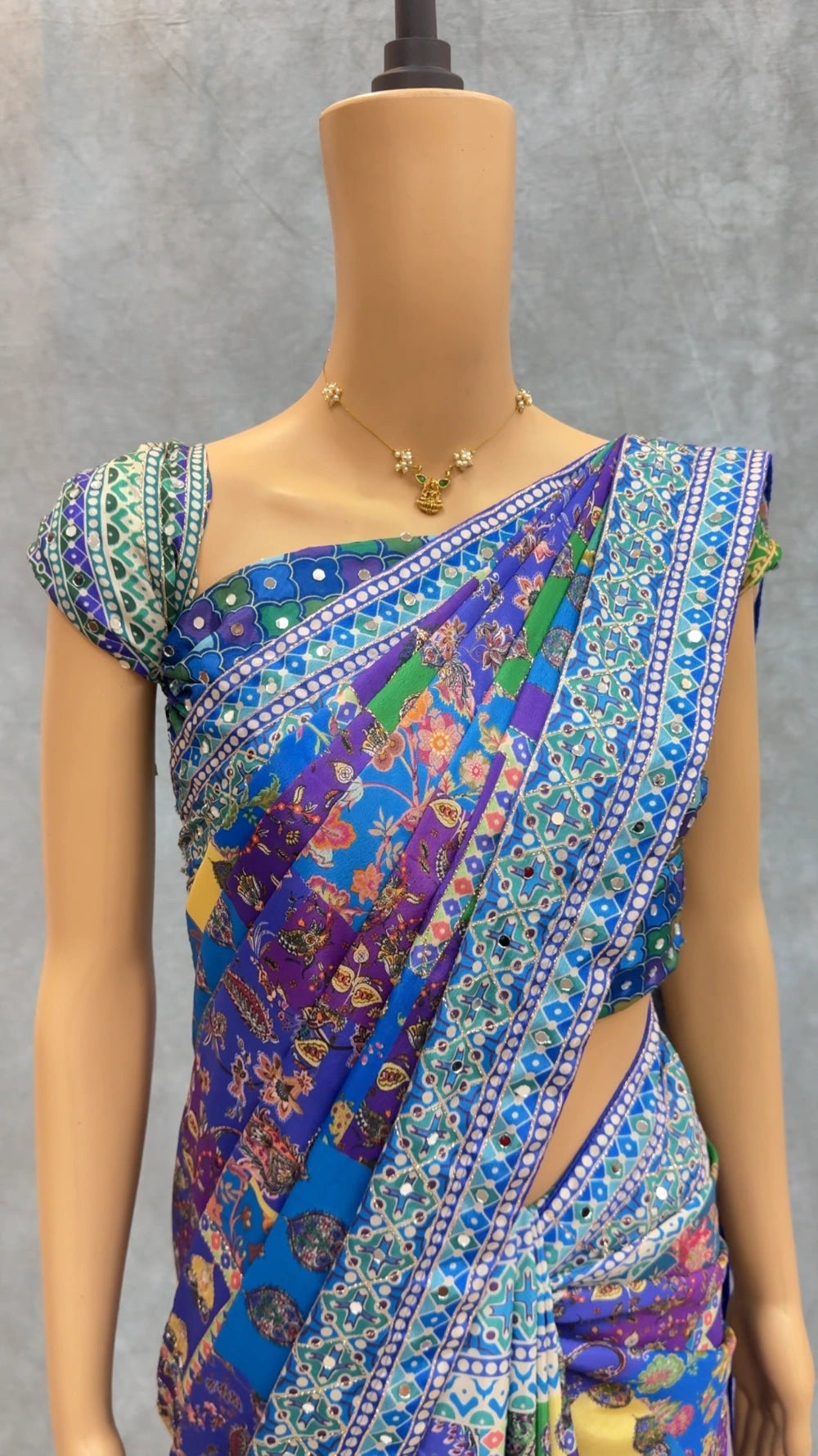 Paired with a matching printed Chinnon blouse, also adorned with real mirror detailing, the ensemble delivers a cohesive and radiant look. Ideal for festive occasions, weddings, and elegant evening wear.