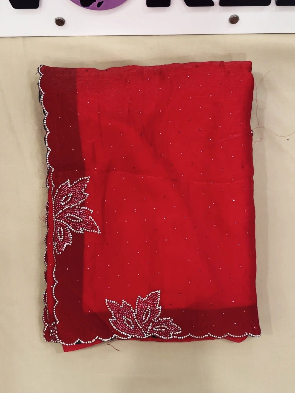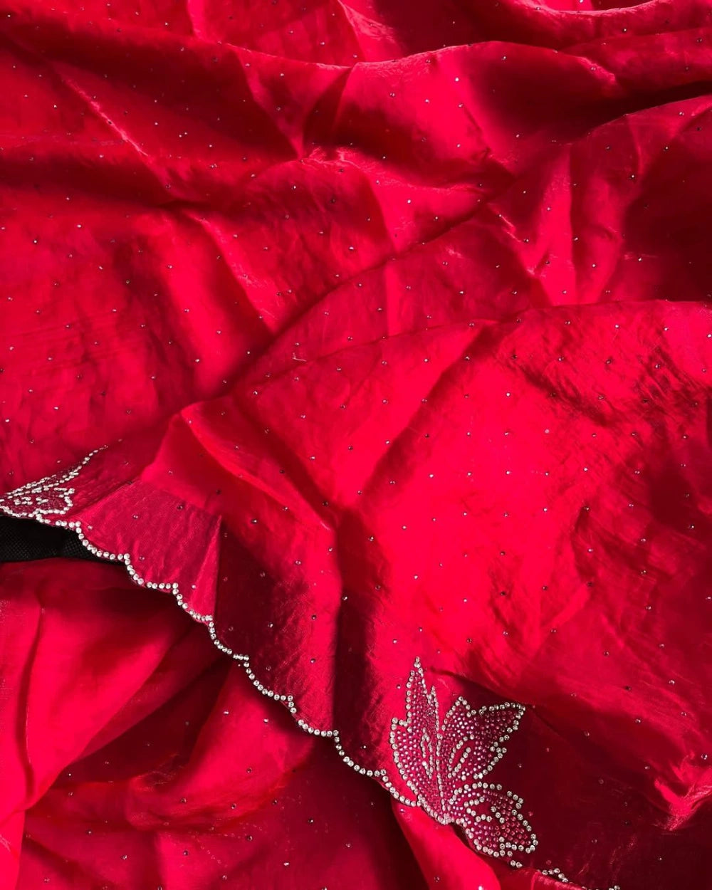 Step into the spotlight with this Blooming Faux Georgette Saree, a dazzling creation exclusive to our store. The saree is adorned with dual-tone Swarovski diamond embellishments scattered all over, creating a mesmerizing shimmer with every movement. The lotus flower embroidery along the border adds a graceful, nature-inspired charm, while the Swarovski diamond cutwork border lends a luxurious designer finish.