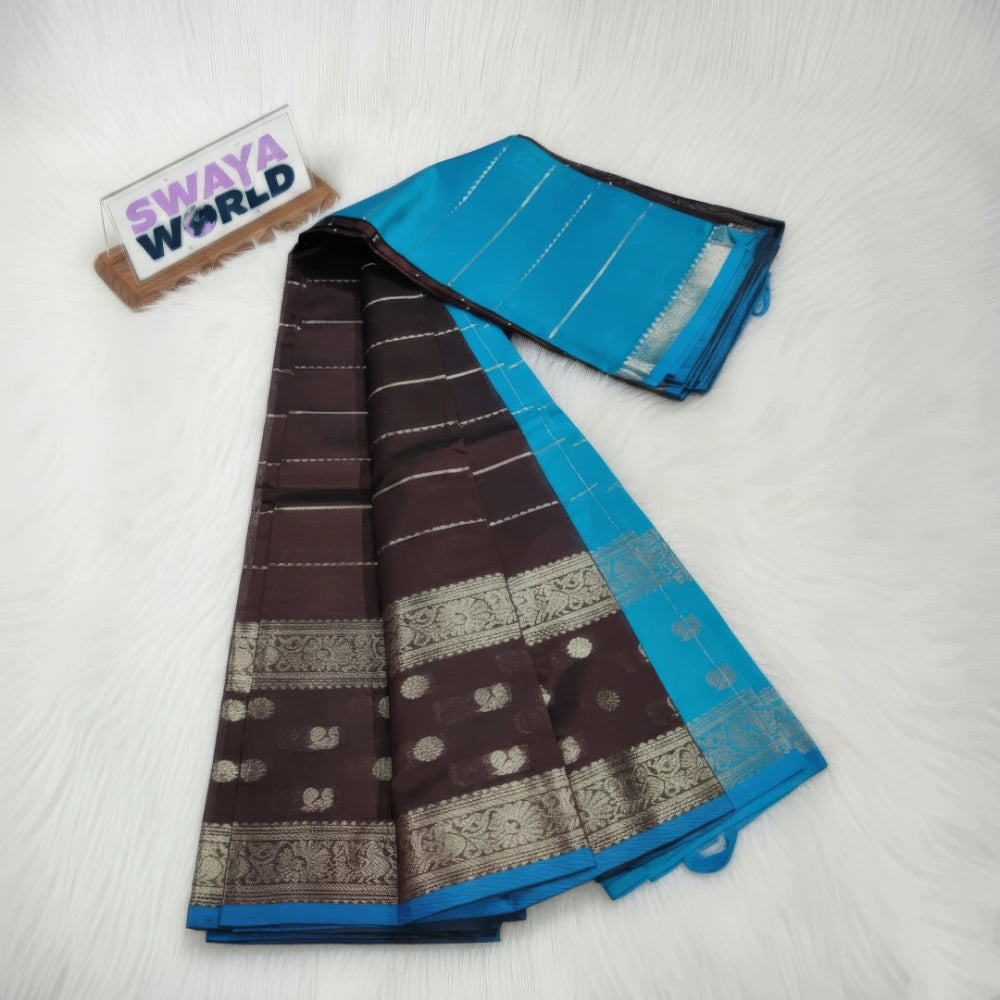 The rich pallu showcases intricate craftsmanship, while the contrast blouse piece completes the ensemble with a bold, balanced look. Ideal for weddings, temple visits, and cultural celebrations, this saree is a statement of timeless beauty and premium quality.