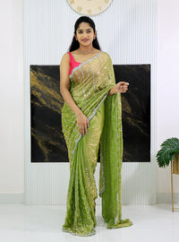 The matching blouse piece is made from the same pixel crushed silk fabric and comes heavily worked, ensuring a cohesive and couture-ready look. Available in two stunning colors — Green and Orange — this saree is a must-have for fashion-forward wardrobes.