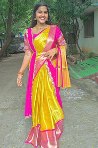 Step into elegance with this New Arrival — a Banarasi Semi Katan Soft Silk Saree in radiant yellow, crafted for a soft, luxurious drape and rich festive finish. The saree features double zari weaving all over, with a solid border and buta design scart, adding depth and traditional charm.