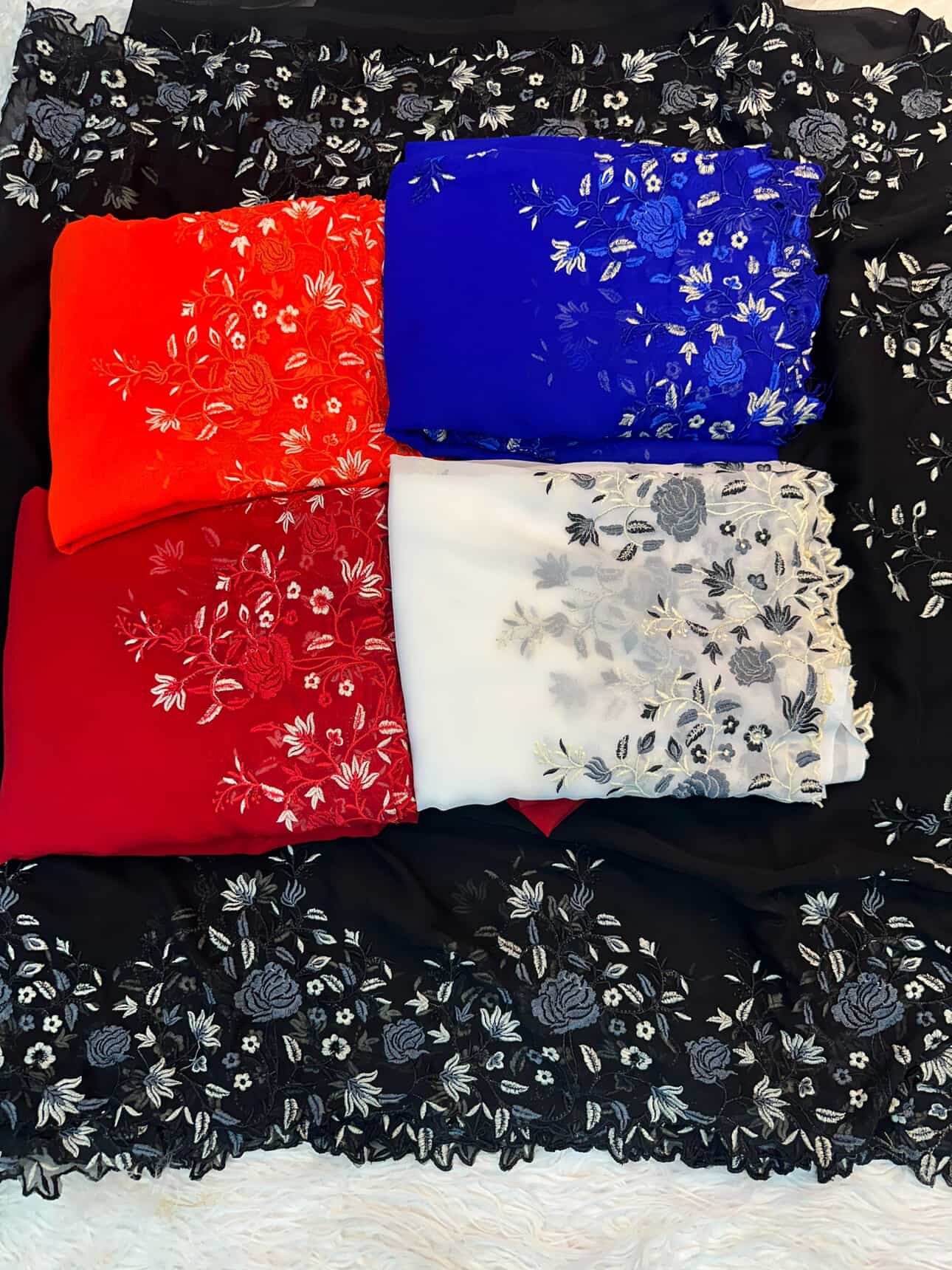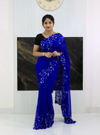 Step into sophistication with this Pure Georgette Saree in a striking Royal Blue hue, designed for timeless elegance and graceful draping. The saree features shaded floral embroidery along the borders, blending subtle color gradients for a refined, artistic finish.