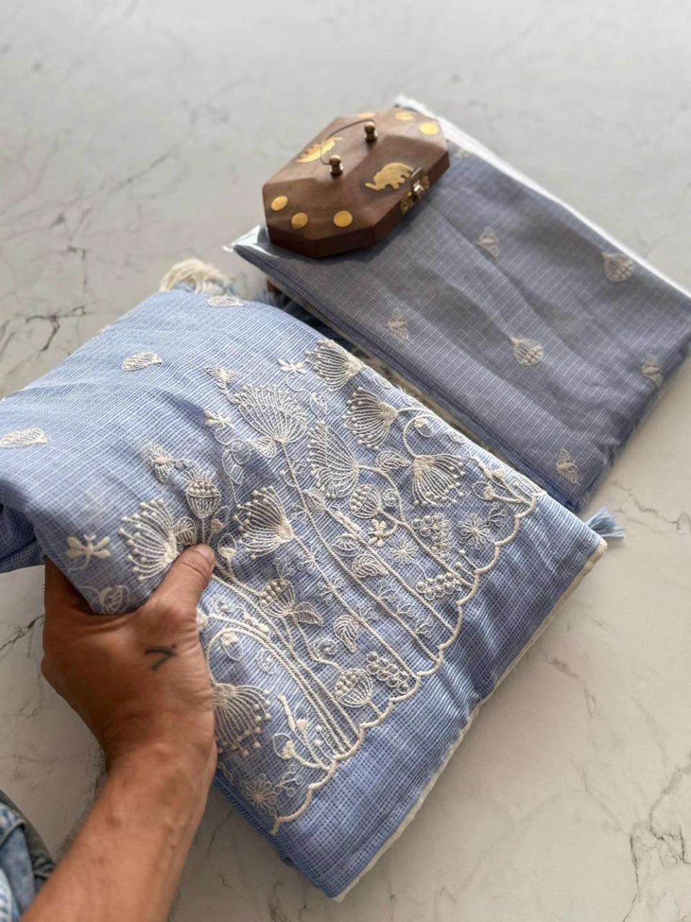 Paired with a running blouse piece in matching Kota Doriya, the blouse is adorned with all-over thread butti work, offering a cohesive and graceful finish to this premium designer ensemble.