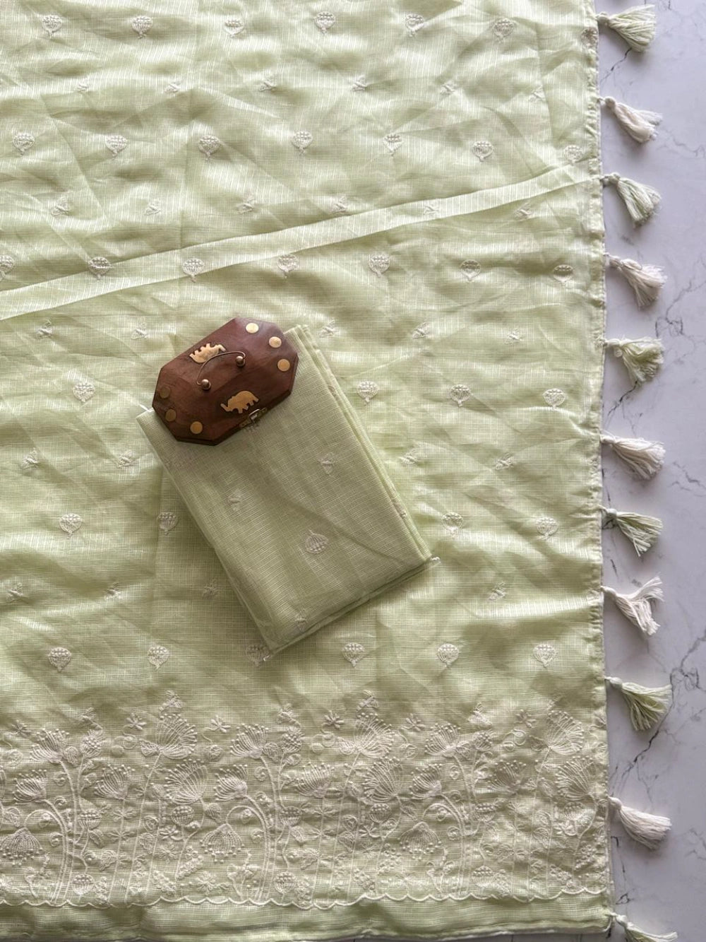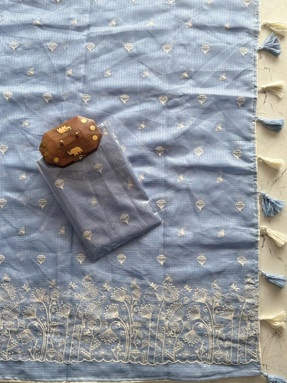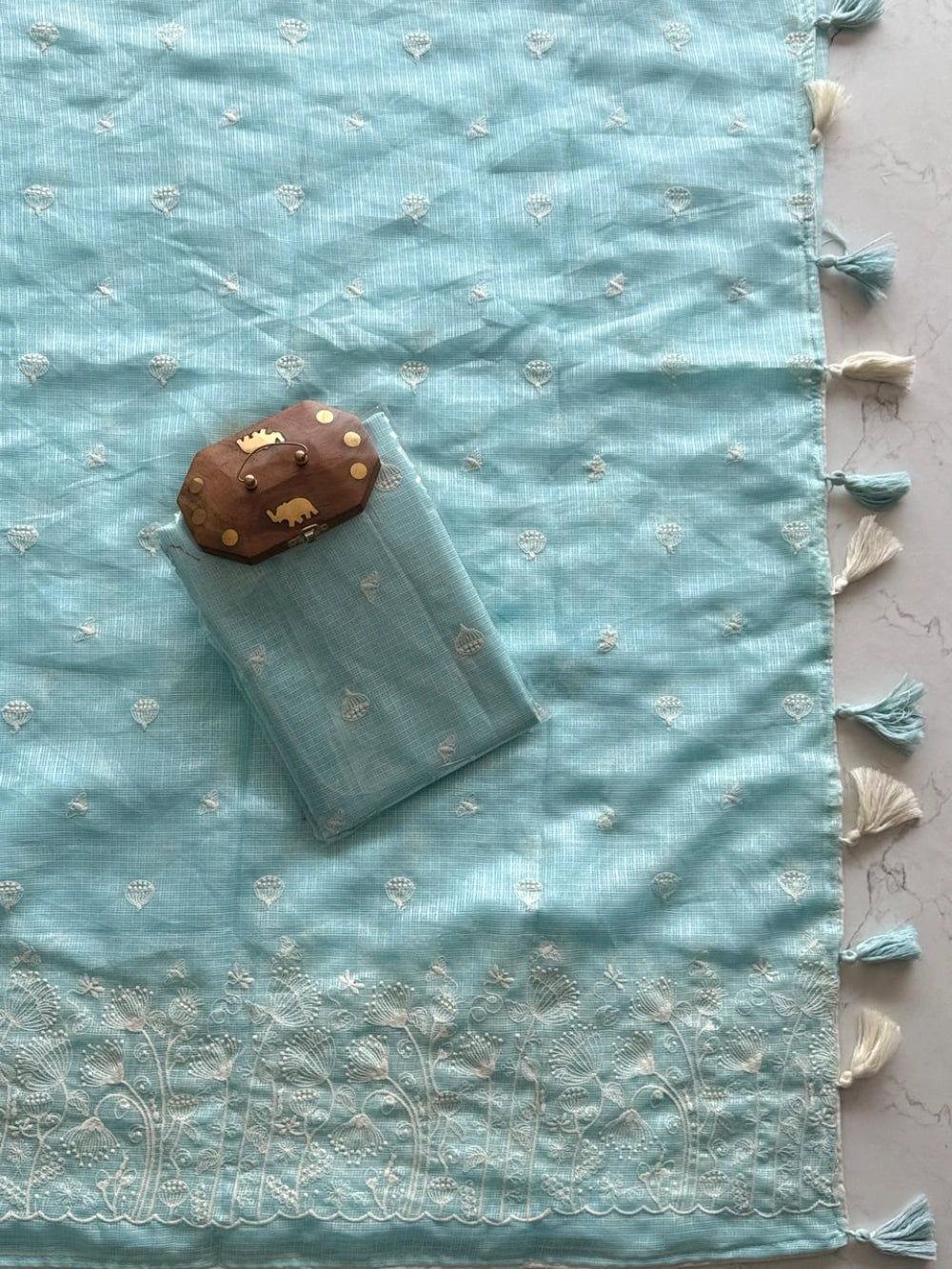 Delicate, breezy, and beautifully detailed — this Soft Kota Doriya Saree is a celebration of fine craftsmanship and lightweight luxury. The saree features multicolor thread figure embroidery that adds a vibrant, handcrafted charm. It’s finished with heavy designer tassels and four-side piping, giving the drape a polished, high-end look.