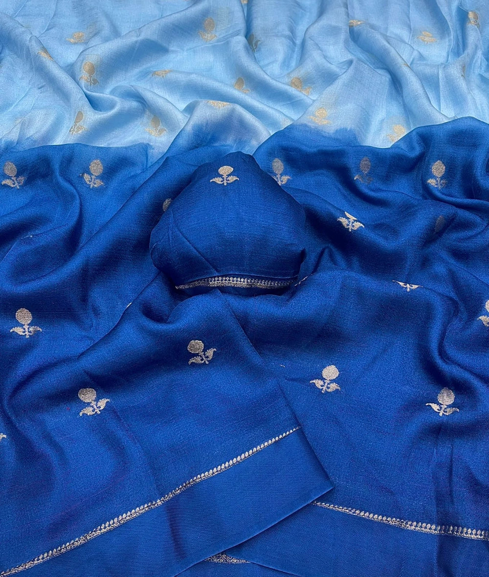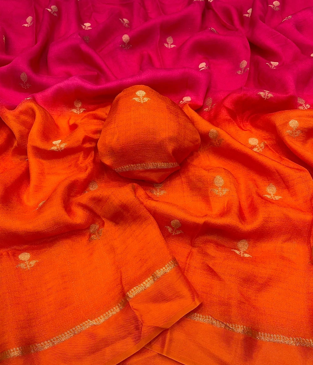 Step into understated luxury with this Pure Viscose Khadi Silk Saree, a trending partywear essential that blends comfort with classic charm. The saree features all-over jacquard leaf figure weaving, adding rich texture and depth to its soft, luminous drape. Finished with sleek satin borders on both sides, it offers a refined silhouette perfect for festive gatherings and elegant occasions.