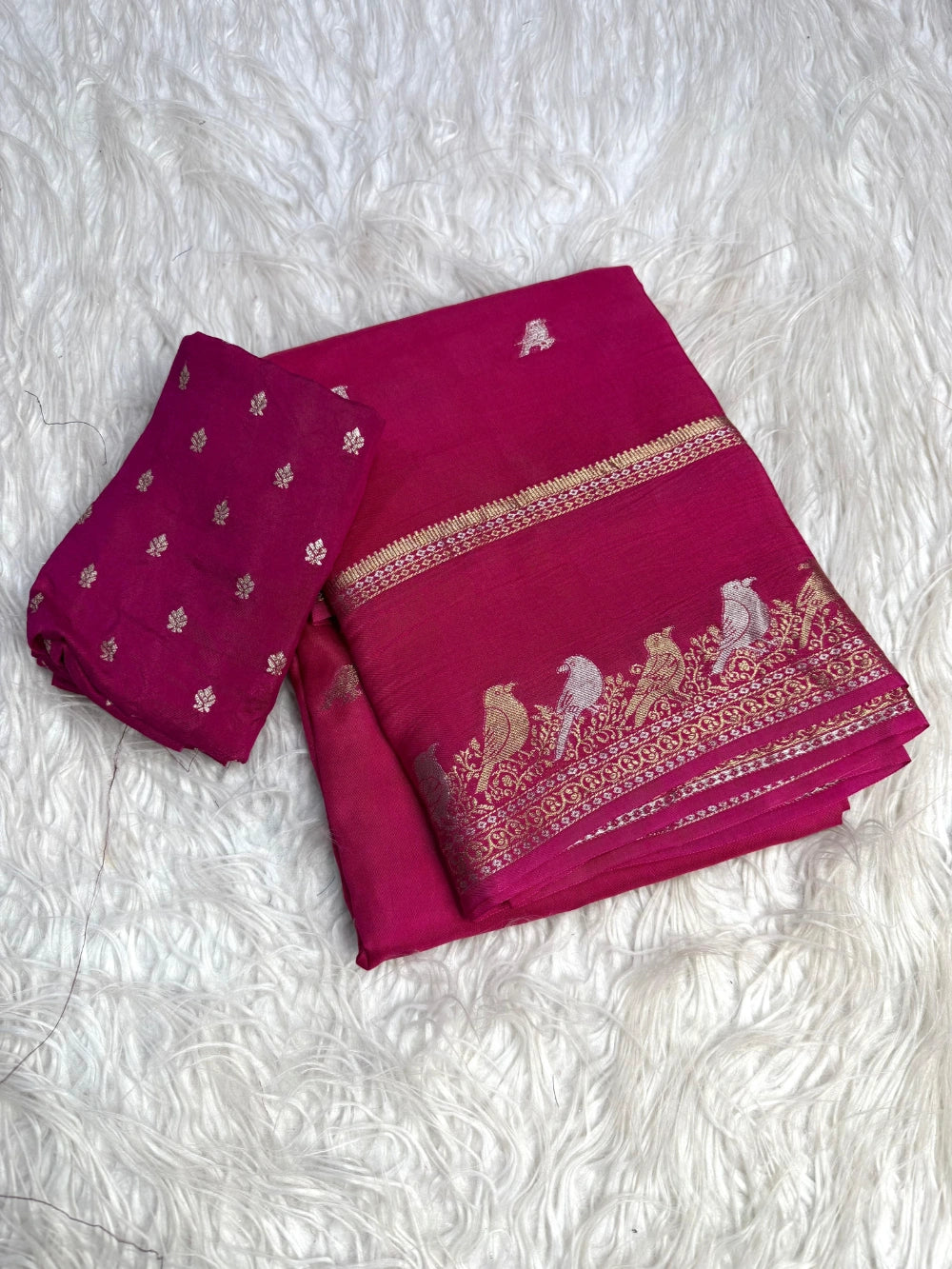 Unveil timeless elegance with this Pure Viscose Mango Saree, a luxurious blend of tradition and trend. The saree features jacquard zari weaving with intricate parrot figure motifs, adding a touch of nature-inspired artistry to its rich texture. The shimmering zari work enhances the mango-textured viscose base, making it ideal for festive and semi-formal occasions.